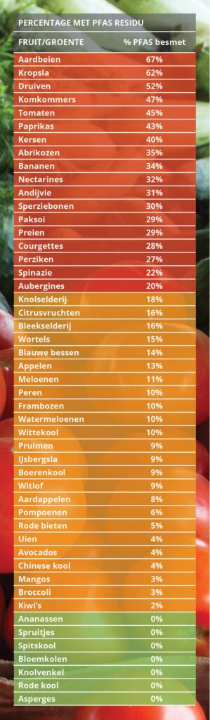 Een eerder onderzoek van onder andere PAN Europe naar PFAS-pesticiden in groente en fruit bracht aan het licht, dat in de periode 2011- 2021 de gemiddelde besmetting van groente en fruit met PFAS-pesticiden, in zowel Nederland als Europa, zelfs enorm toenam. Nederlands fruit en groente waren zelfs vaker besmet dan die uit het buitenland.