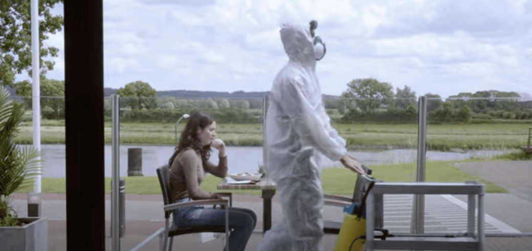 5. “Ja, lekker dan”. Een jonge vrouw krijgt van de ober een biologische Griekse salade aangeboden.