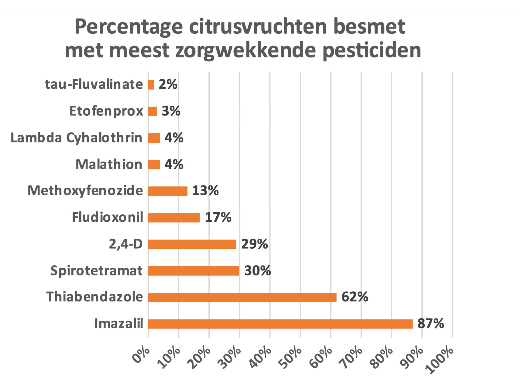 89% van het citrusfruit bevat gifresten die geclassificeerd zijn als mogelijk kankerverwekkend, mutageen of reproductie toxisch. 70% bevat één of meer pesticiden met een hormoonverstorende werking. 27% bevat één of meer PFAS-pesticiden. 4% bevat bewezen kankerverwekkende, mutagene of reproductie toxische pesticidenresten.