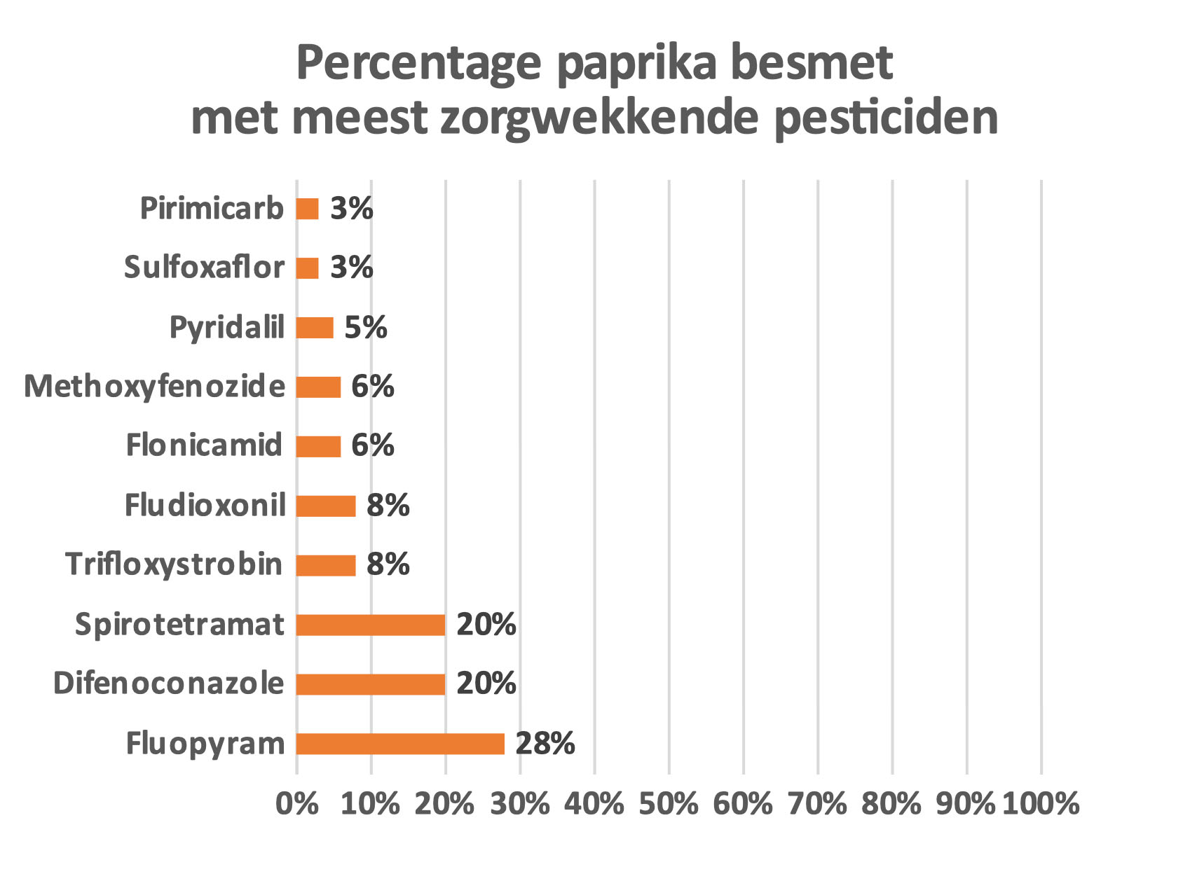 48% van de paprika bevat één of meer PFAS-pesticiden. 35% bevat één of meerdere 'Kandidaten voor Vervanging'. 24% bevat gifresten die ervan verdacht worden kankerverwekkend, mutageen of reproductie toxisch te zijn. 15% van de paprika's bevat één of meer pesticiden met een hormoonverstorende werking. Er werden geen pesticiden gevonden die bewezen kankerverwekkend, mutageen of reproductie toxisch zijn.